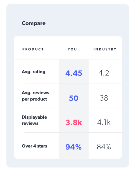 Everything from competitive benchmarking to customer sentiment. Get easy-to-digest insights that can help you improve your products, upgrade your marketing, and reduce those pesky return rates. We analyze UGC across our wide network of retailers to give you the right tools to smash your KPIs.